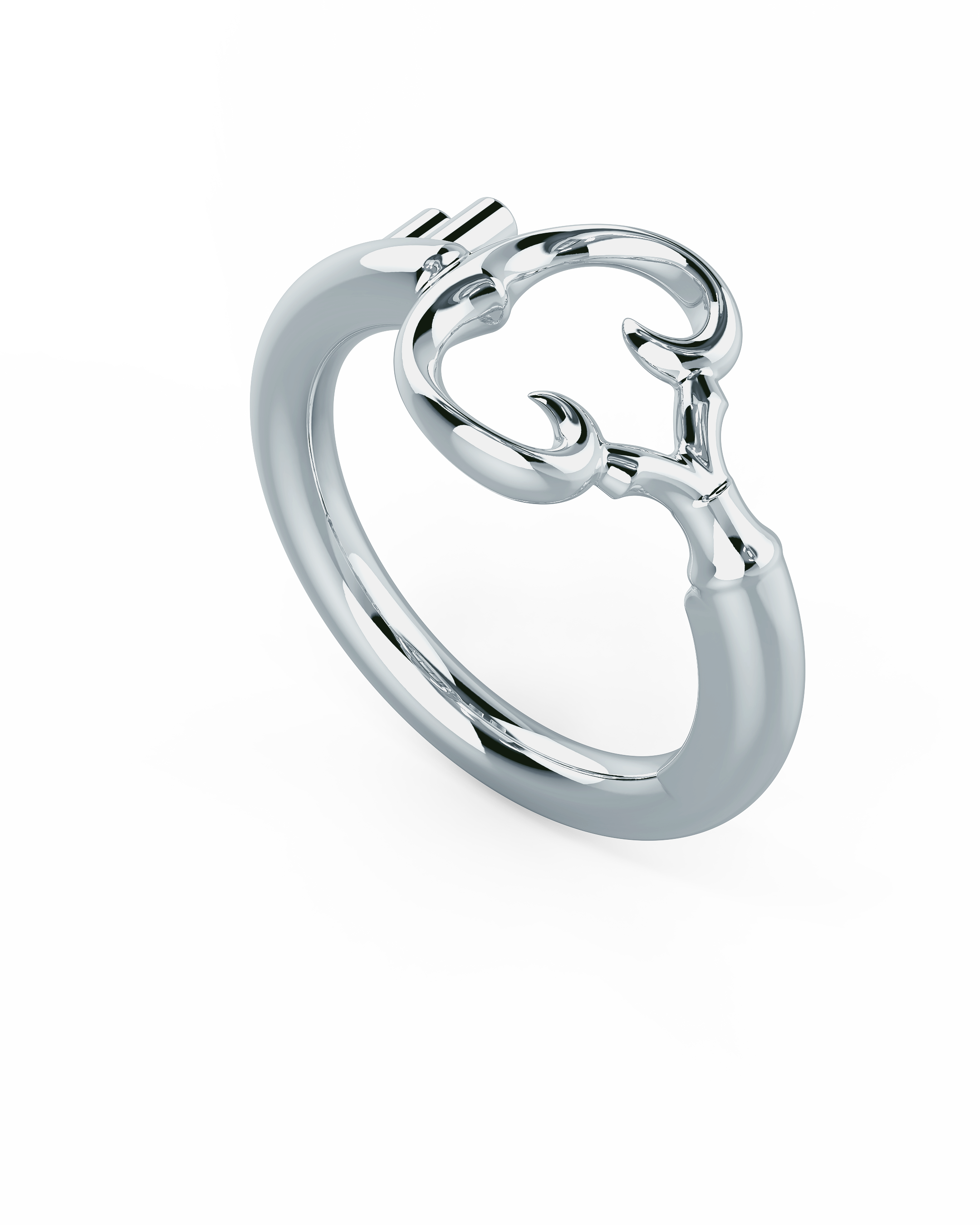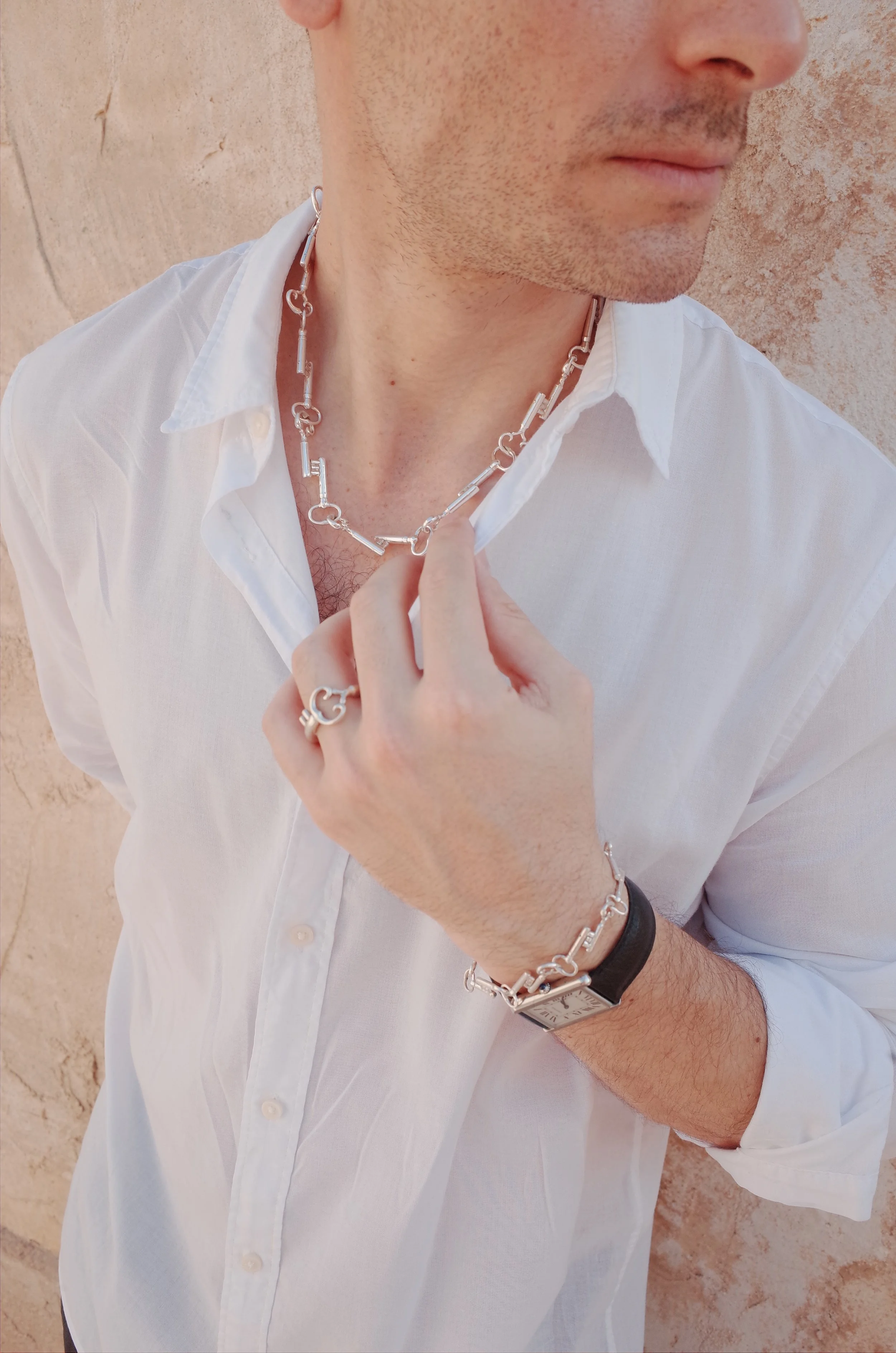 the key ring represents the essence of the eternal return collection. the eternal pull between departure and reunion. its sculptural silhouette transforms the familiar key into an emblem of devotion and remembrance